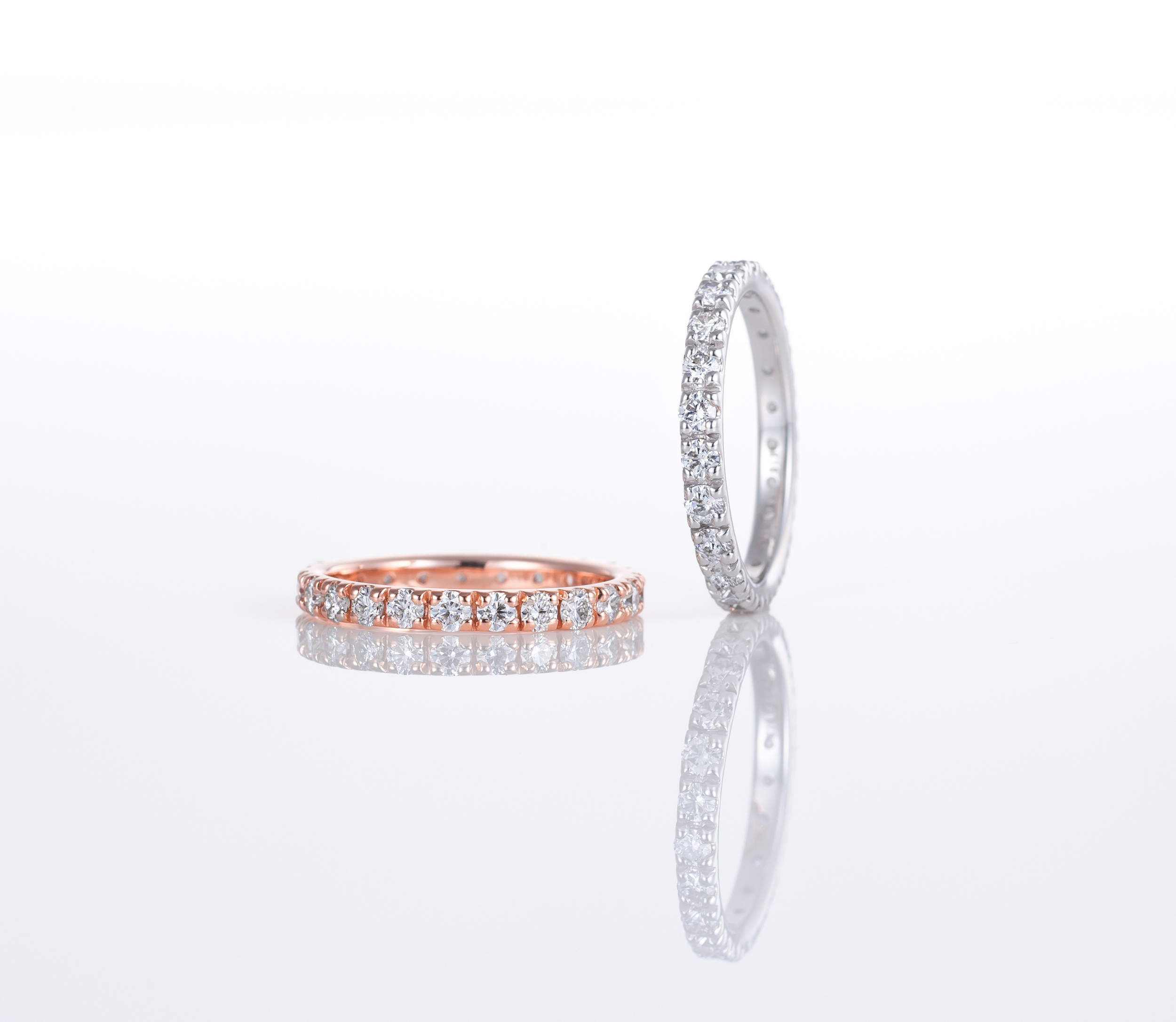 スコープでご覧いただきました後には、ハート&キューピットダイヤモンドのとそうではないダイヤモンドを肉眼で見比べていただきます。「あ!違う!」「光り方が違う」「すっごく輝いている」「こっちはこんなに明るい!」と即座にその違いを実感していただけます。エタニティリングは全周にグルっとダイヤモンドが並びますので、たった一粒で実感された輝きの違いを、今度は沢山一度に感じていただくことになります。小さな一粒の輝きの力が全体になりますので、より一層輝きが強く感じられそれはそれは美しいエタニティリングが完成いたします。